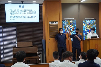 9月14日(水)、関東学院高校のメービー礼拝堂で2022年度の同科目の研究発表会が行われ、高校生たちが4月より研究を進めてきたテーマについてプレゼンテーションを行いました。生徒たちは、「味覚と資格の相関性について~色覚、味覚、触感を駆使して苦手な味を克服できるか~」、「プラナリアの再生と記憶」、「昆虫の光走性とその波長について~なぜ発行キノコは緑色に光るのか~」といったテーマで発表を行い、なぜこのテーマを選んだのかや実験方法、その結果などについて、8グループが熱いプレゼンテーションを繰り広げました。
