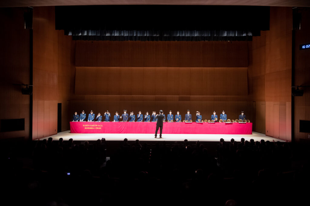 最後に関東学院O.C.Cハンドベルクワイアの生徒たちが記念演奏を披露しました。関東学院O.C.Cハンドベルクワイアは関東学院中学校高等学校の部活動として、学校内外で活動しています。来賓の方々は、生徒たちが奏でる美しい鐘の音色に耳を傾けていました。