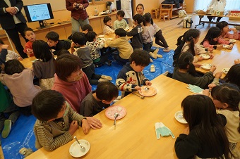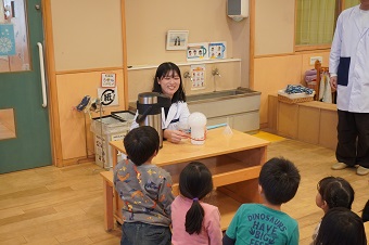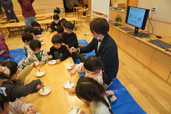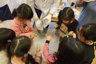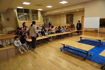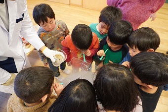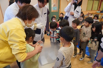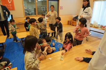 友野准教授と研究室の学生たちがこども園に到着して実験の準備を始めると、興味津々な園児たちが早速集まってきて、にぎやかな雰囲気の中イベントがスタートしました。