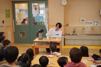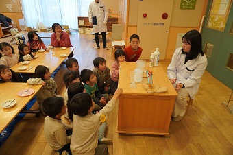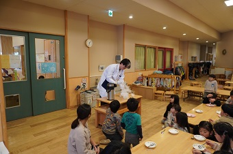 最後の実験ではドライアイスの上にうまくそっとシャボン玉を乗せると、シャボン玉が凍る様子を学生が実演。園児たちの声援を受けながら学生が実験を成功させ、友野准教授はシャボン玉が凍ったり割れたりする仕組みなどをお話しました。