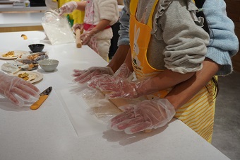 笑顔を浮かべつつ、時に真剣な表情で取り組む子どもたち。めん棒でパイシートを伸ばしたり、ハケを使ってパイシートを卵黄に塗る工程では、子ども達が粘土やおえかきのように遊びの延長で調理を楽しんでいる様子が見受けられました。学生たちも、子どもたちの作業の様子を褒めたり、作業が遅れてしまった親子にも丁寧に手順を伝えたりと、コミュニケーションを取りながら接していました。