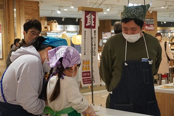 関東学院のびのびのば園は、栄養学部の細山田ゼミナールの学生が考案した、アレンジレシピをもとにした親子調理体験イベント「かんたんレシピ!! 親子クッキング体験-くまさんのおひるねチョコパイ編-」を1月下旬に開催しました。 同園は、2021年に栄養学部細山田ゼミナールの協力のもと、無印良品の商品を使用した「親子でつくれる簡単レシピ」を作成しました。このレシピの発行に合わせて、親子時間の創出を目的とした調理体験イベントを開催予定でしたが、新型コロナウイルス感染症の影響で中止を余儀なくされており、2年越しの待望の開催となりました。2日間で約30組の在園児の年長親子、在園児以外の地域の年長以上の親子が無印良品 港南台バーズに集まりました。 本イベントでは、細山田ゼミに所属していた当時の3年生が考案した11品目のアレンジレシピから、「てんさい糖ビスケット」を使用した『くまさんのおひるねチョコパイ』を調理体験するプログラムが実施されました。日頃、同園の給食を作っているソシオフードサービス株式会社スタッフがファシリテーターをとして進行し、同ゼミナール4年生の3名の学生たちも、参加親子の近くでサポートに入りました。