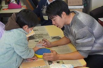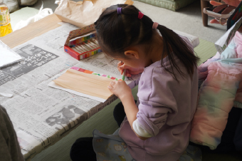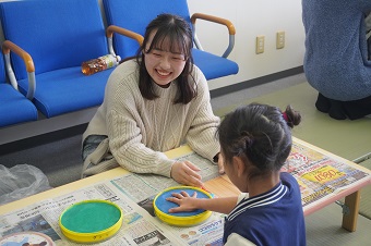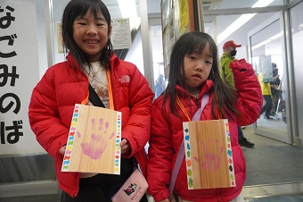 「あそびのば」で行われた体験型ワークショップでは、同園が日頃から取り組む「木育」をベースとした経木(薄い木の板)に手形スタンプを押す「木の手形カードワークショップ」を実施。子どもたちは、白い画用紙に両面テープで経木を貼り付け、クレヨンで余白にリボンやハートマークなどを自由に描き、青、ピンク、緑の3色から選んだインクで経木に手形スタンプを押しました。ボランティアとしてブースの運営に携わった教育学部の学生たちも、子どもたちと目線を合わせて話したり、手形カードが出来上がった瞬間に拍手しながら褒めたりして、ブースに足を運んだ100名ほどの子どもたち一人ひとりと丁寧に接しました。 参加した保護者は、「子どもが生まれた時に紙ねんどで手形を残していましたが、今回スタンプという形で記念に残すことができてとても感慨深いです。子どもたちの成長を感じる事ができました」と話しました。