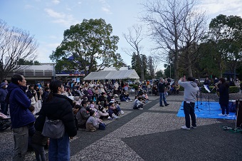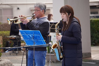 イベント終盤に差し掛かった頃、同園の教職員がアンサンブルを披露する「オープンのば」には多くの来場者が集まり、「大きな古時計」「君をのせて」「小さな世界」「さんぽ~となりのトトロ」「ホール・ニュー・ワールド」の5曲をサックス、トランペット、クラリネット、フルートなどの楽器で演奏しました。来場者たちは身体でリズムを取ったり、手拍子しながら歌詞を口ずさんだりと、会場全体が盛り上がりを見せました。 石井教諭は「日頃、園で取り組んでいることで、園の良さが伝わったらと思い、木育ワークショップを出展することにしました。なかなか体験できない木を貼り付ける作業や、3色の手形スタンプから自分で色を選ぶ環境を提供できたことは良かったのではないかと思います。のばマルシェから生まれる繋がりも大切にしていきたいですね」とコメントしました。