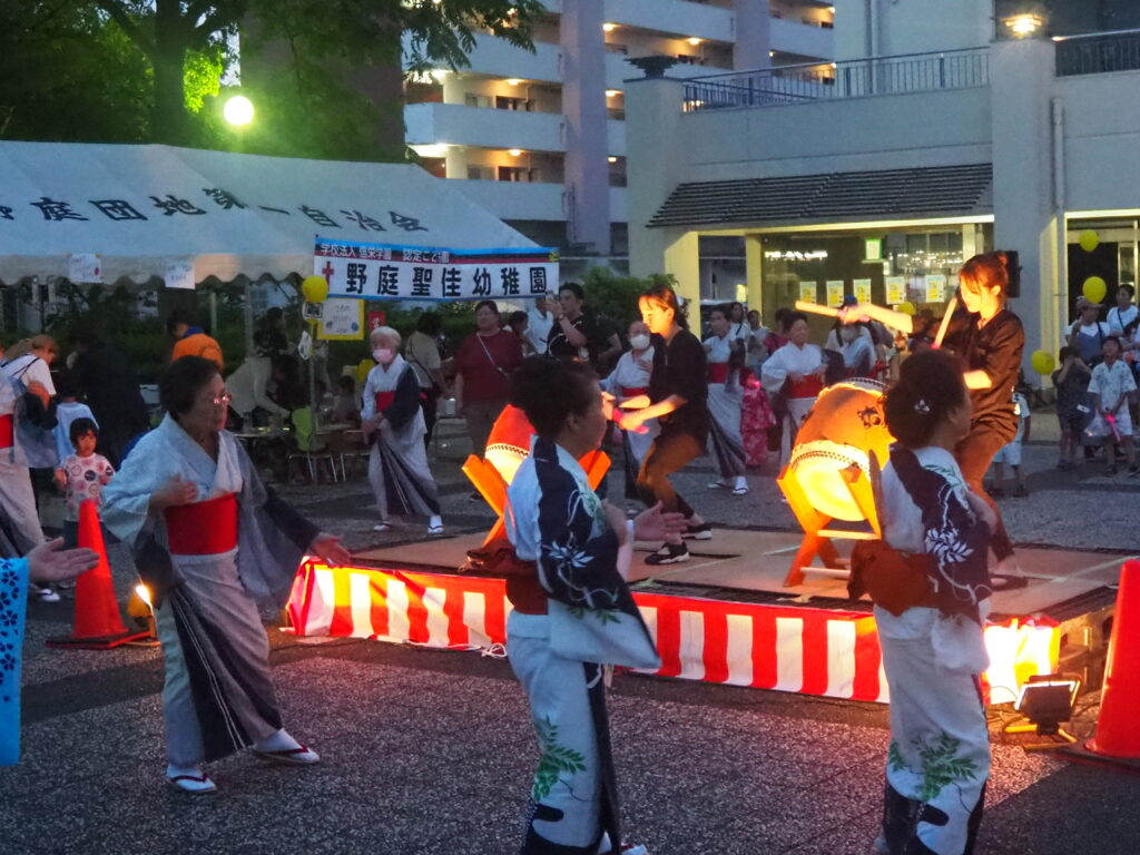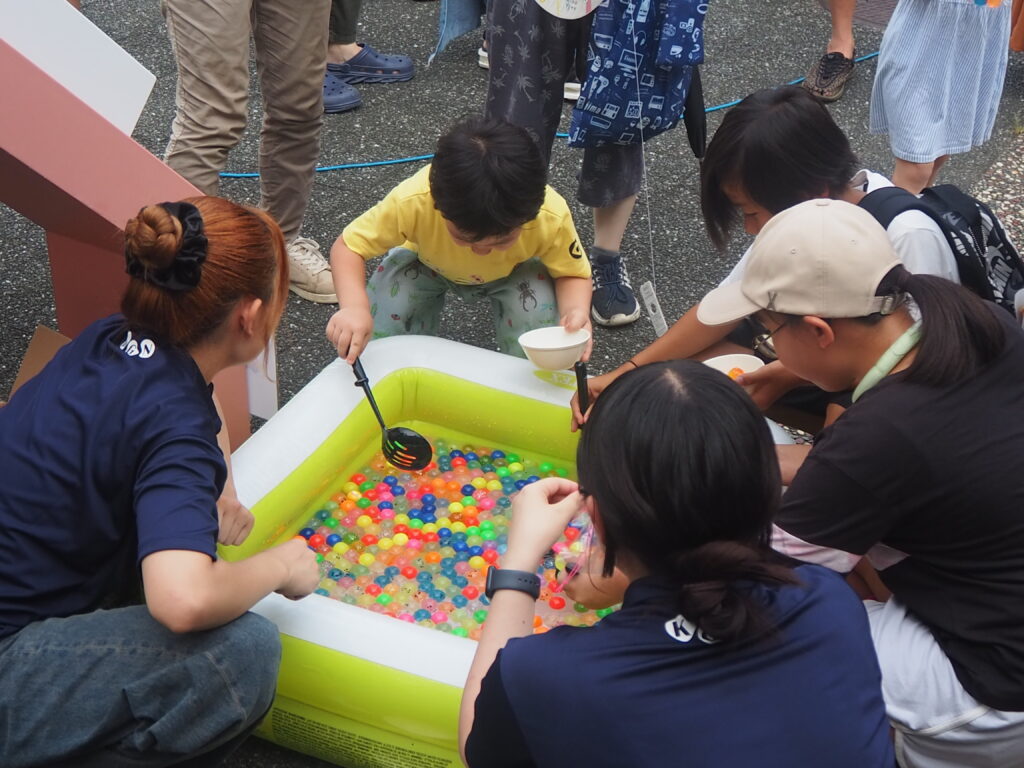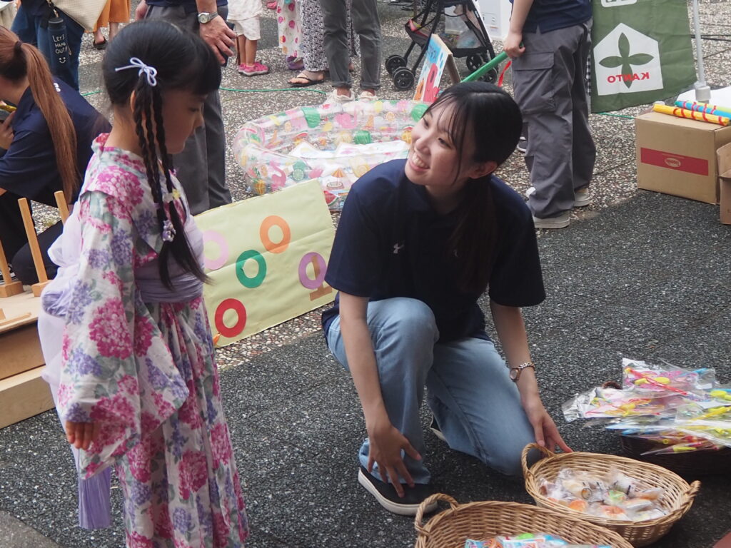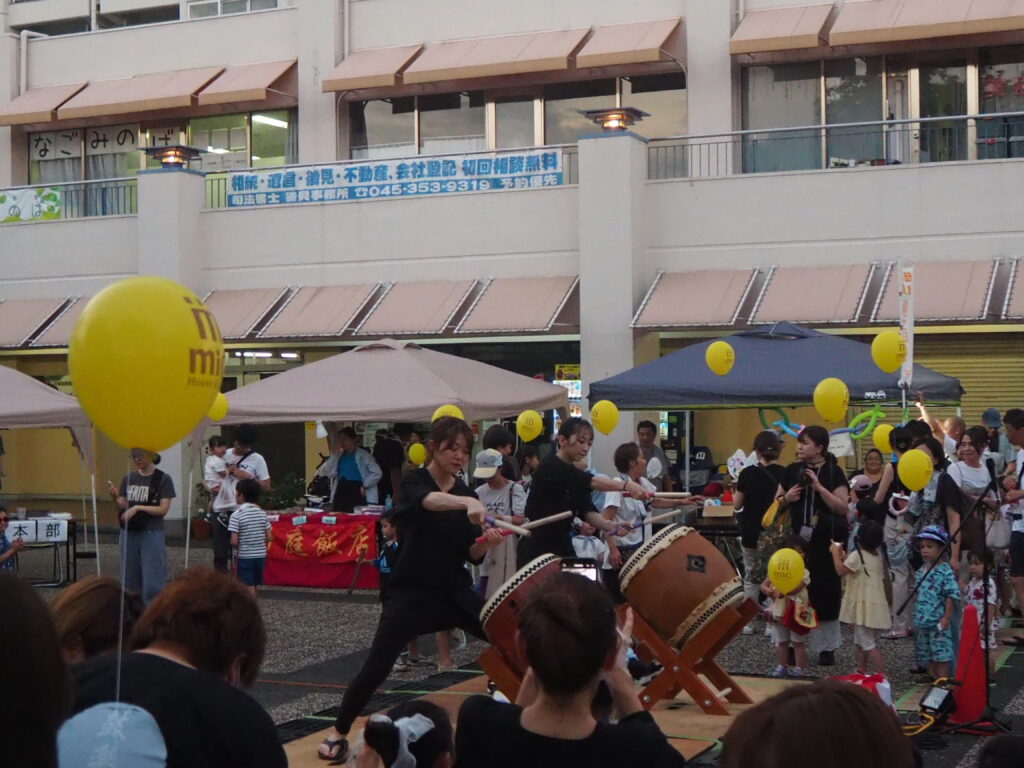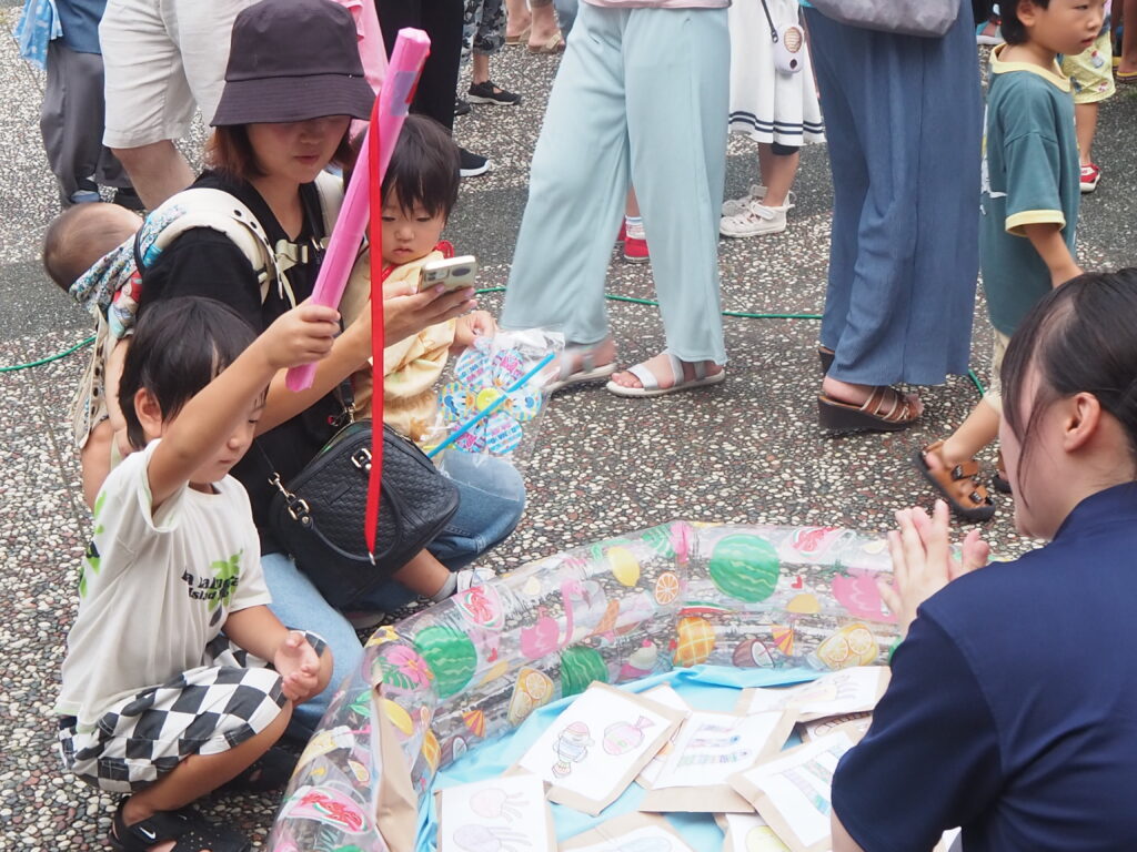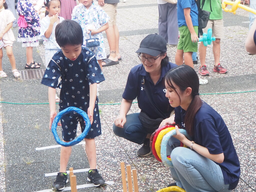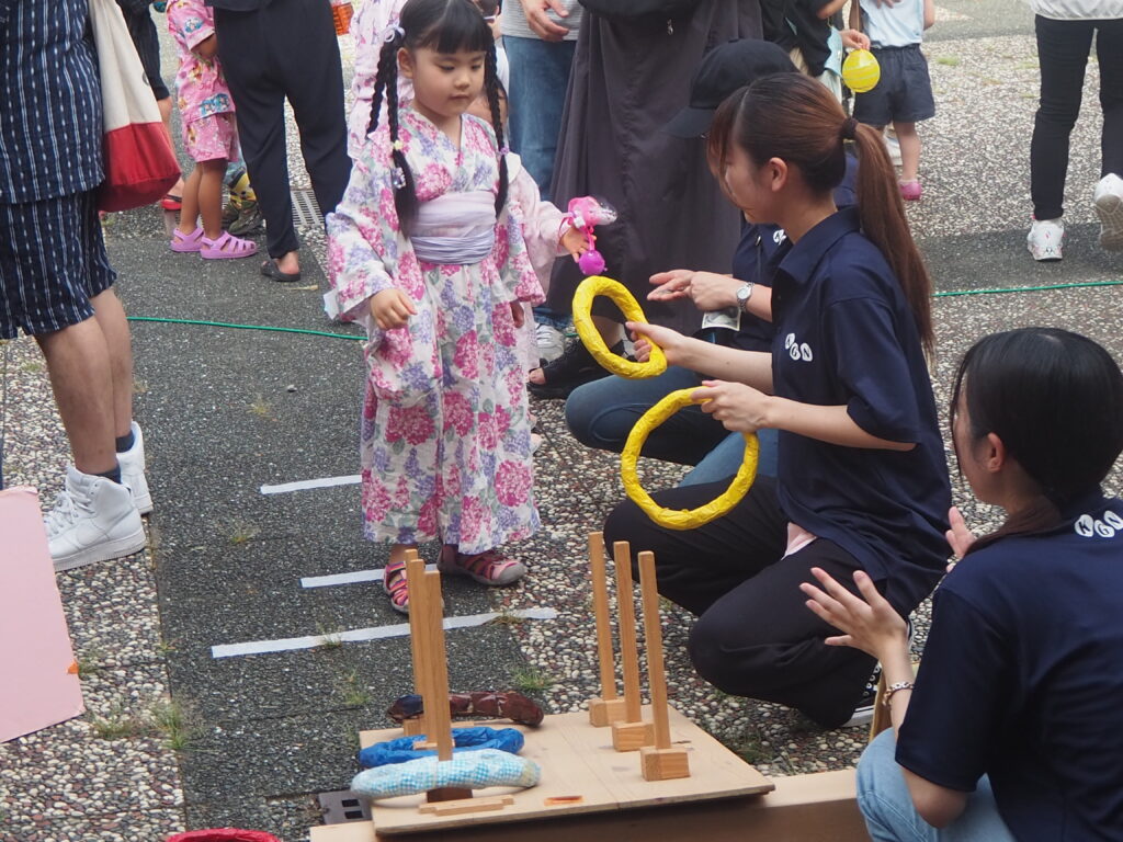のびのびのば園は、さかなつりやスーパーボールすくい、ヨーヨーやわなげなどのブースを出展。また関東学院大学教育学部の学生も7名ボランティアとして参加しました。16時の開始時刻には、すでに会場には大勢の家族連れが来場しており、のびのびのば園のブースにもたくさんの子どもたちが訪れていました。18時過ぎからは中央の広場で太鼓のパフォーマンスに合わせて盆踊りが行われるなど、会場は人が途切れることなく賑わいを見せ、