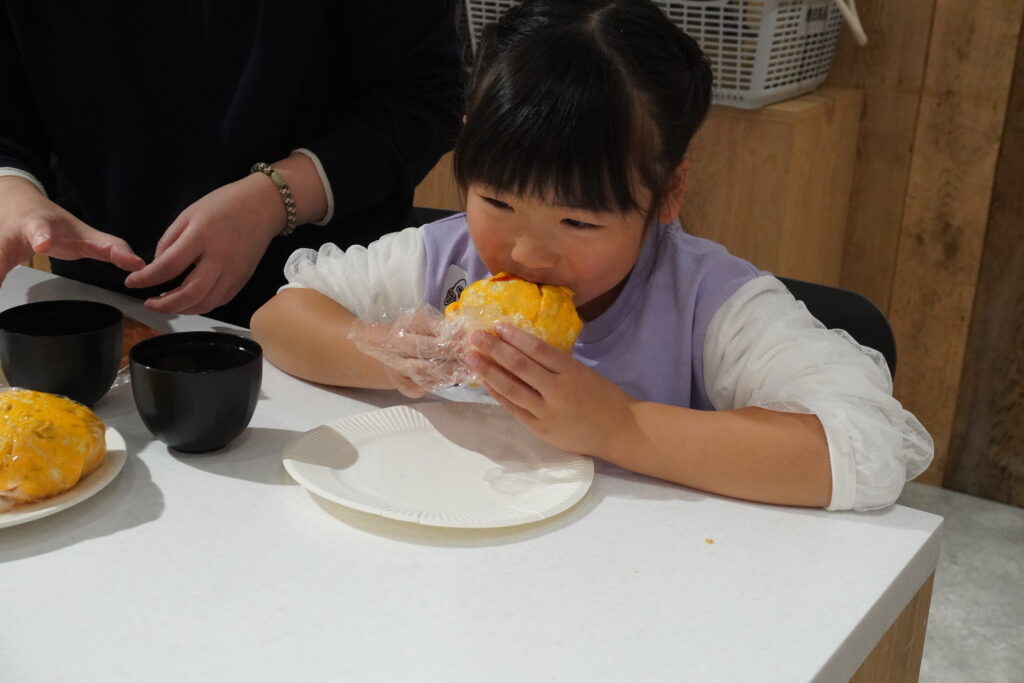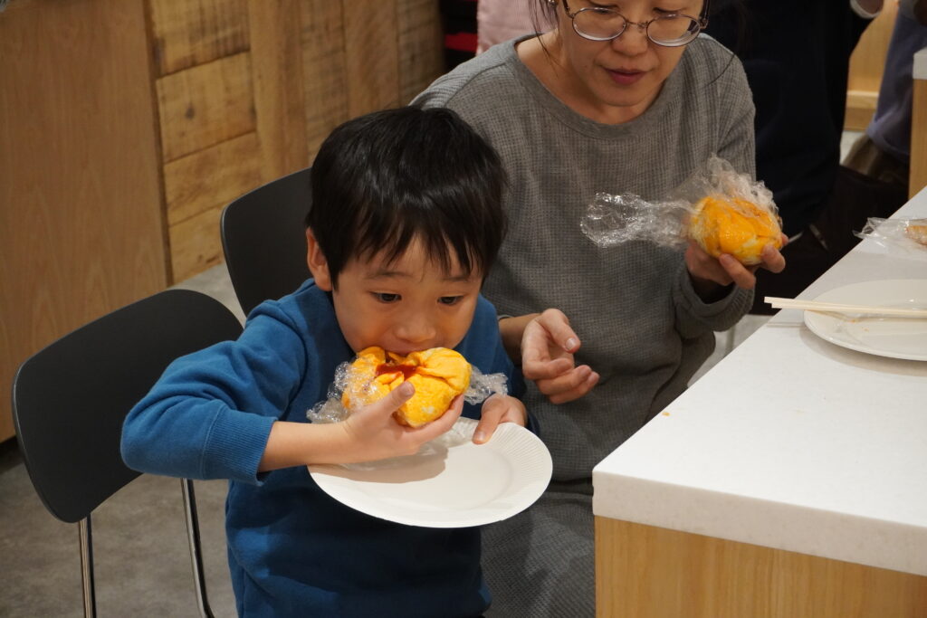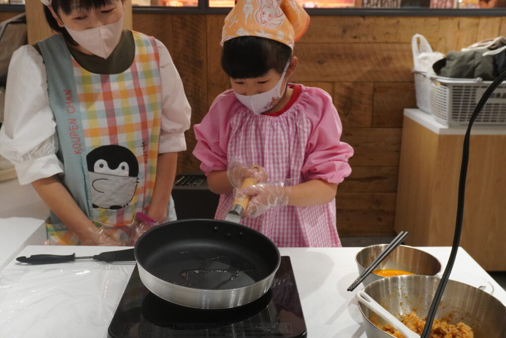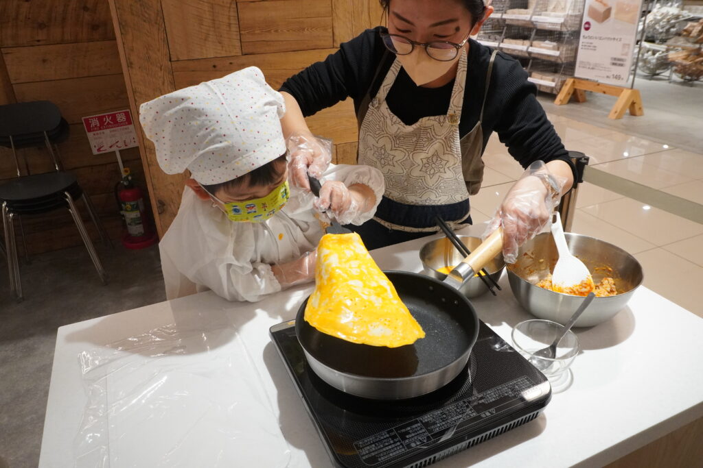 10月・11月には、無印良品 港南台バーズにて第3弾のレシピ集の中から「オムライスおにぎり」と「おこげとあおさ長ネギの味噌汁」を作る「親子クッキング体験」を開催。普段、家で一緒に調理することは少ないという親子も、一緒にオムライスの卵を焼くなど、調理することの楽しさを体験しました。当日、サポートで参加した栄養学部の学生たちへ質問をする保護者も見受けられ、アレンジレシピのアイデアに関心している様子でした。